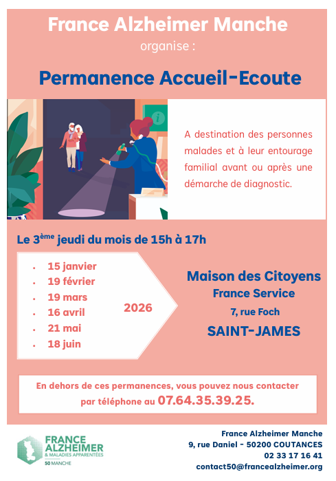 L'antenne de la Manche de France Alzheimer organise des permanences d'accueil et d'écoute tous les 3e jeudi du mois à la maison des Citoyens, France service de Saint James